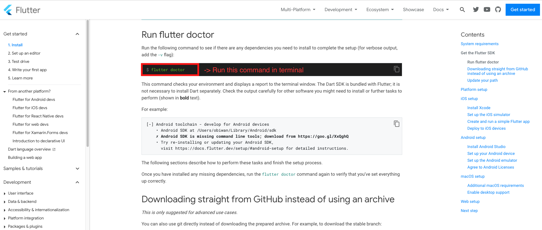 - Run the "flutter doctor" command to see if there any dependencies you need to