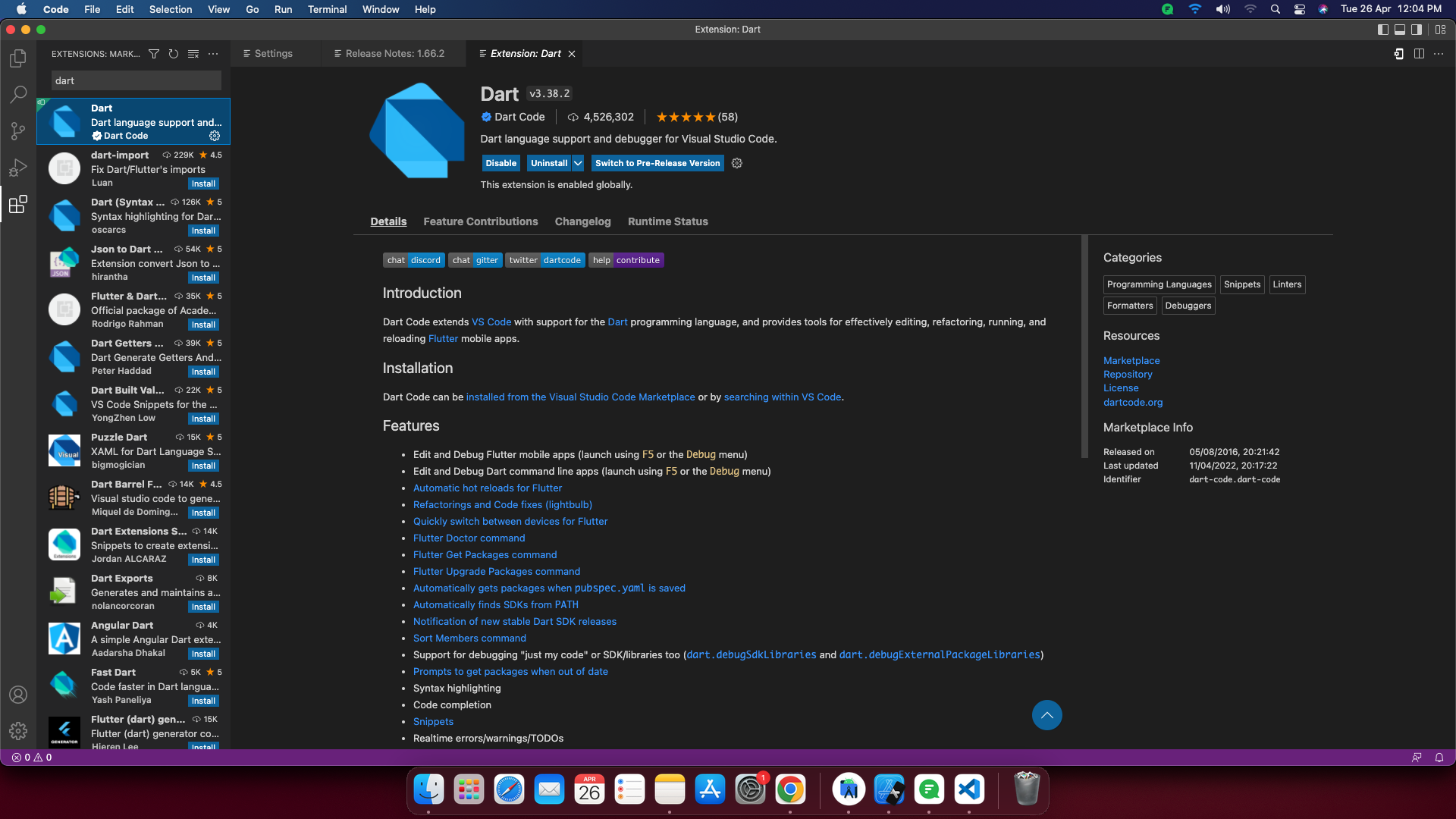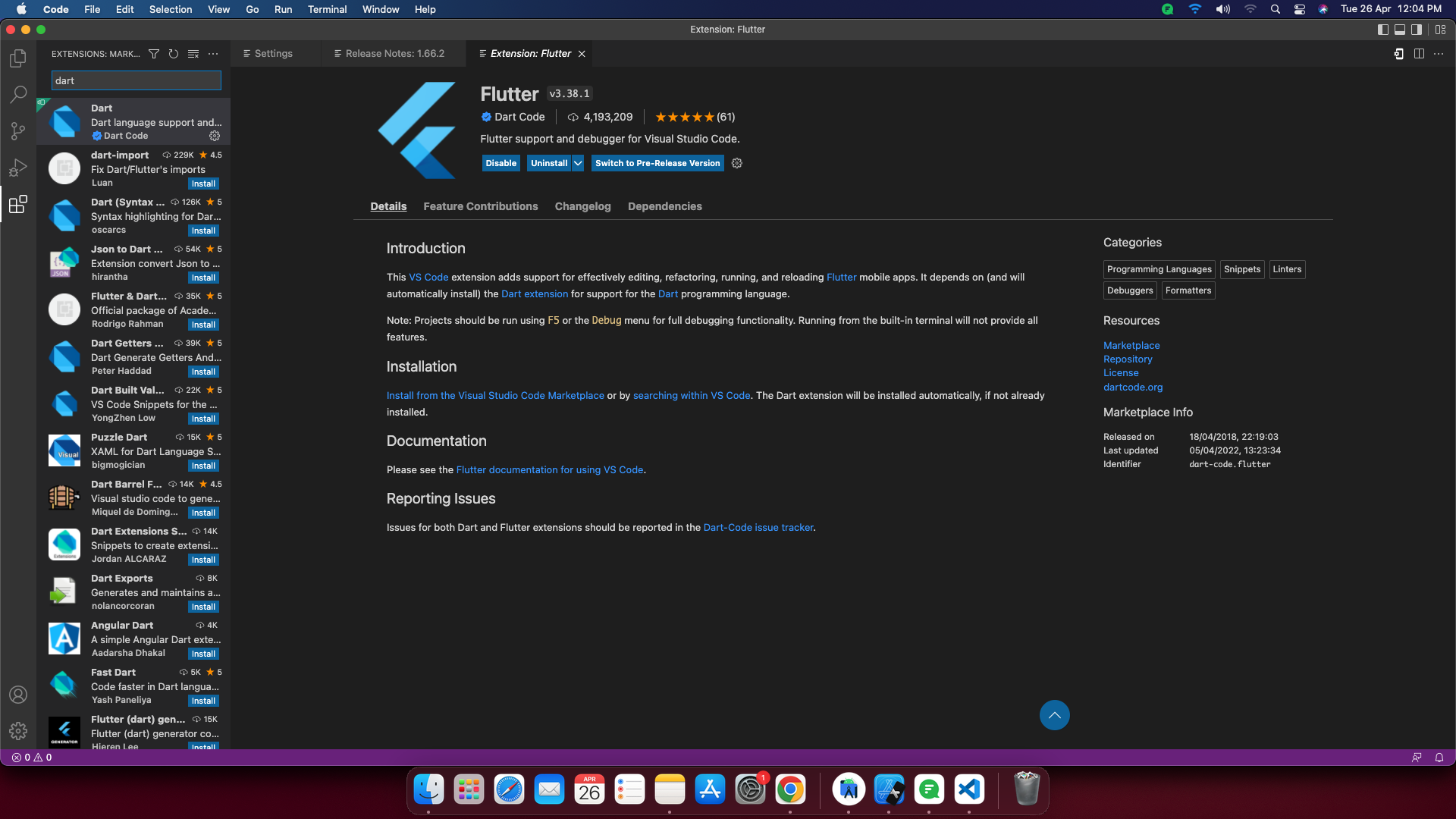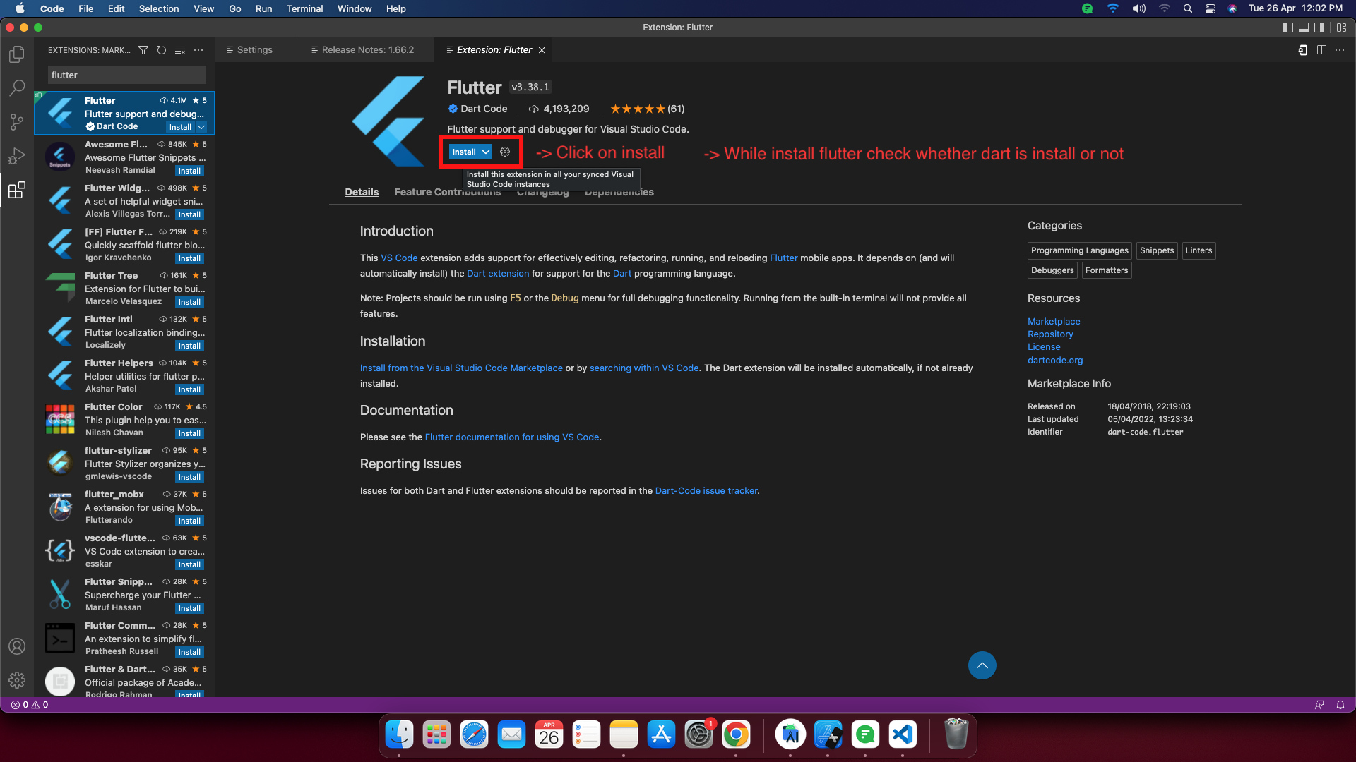 - Open Visual Studio, install Flutter and Dart.