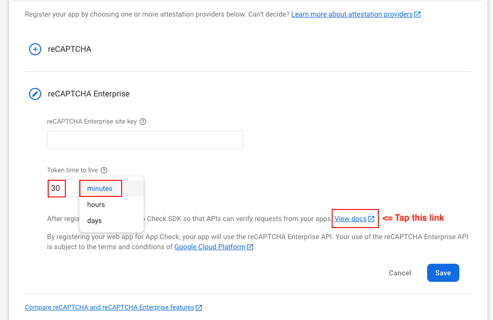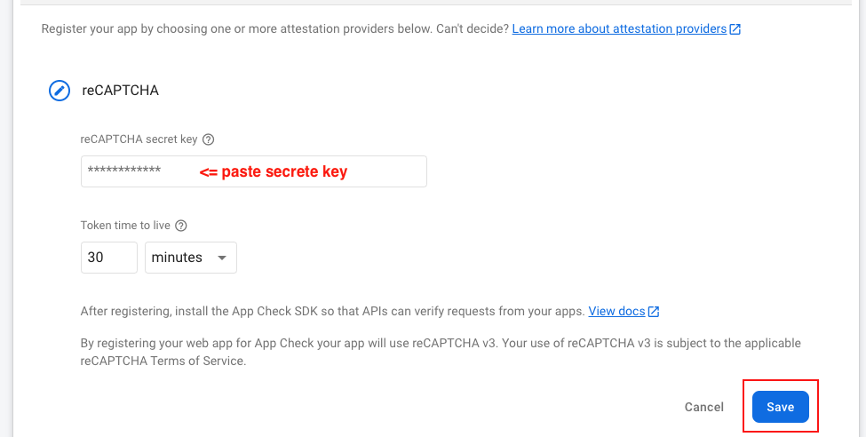 - Now you need to app check for firebase security purpose, so go to your firebase console and click on register button so you can see 2 options reCAPTCHA & reCAPTCHA Enterprise