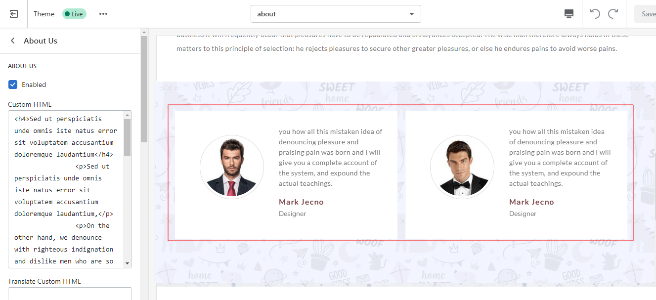 | page.about | About page template. Used for about pages and set page with section and blocks. | Multiple |