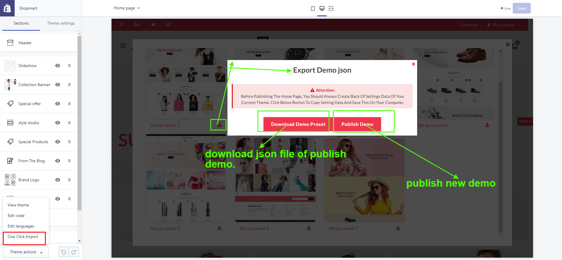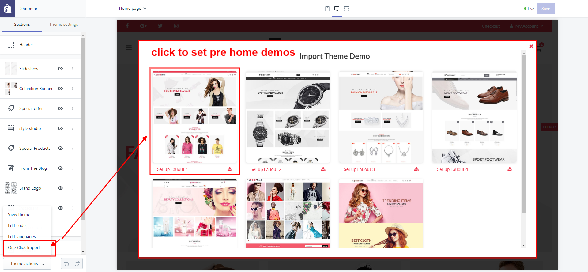After Theme installation is complete , we have kept Home 01 as default. if you want to use any other home page preset layout go to Customize and click to more More Actions at top left and choose one Click Import.