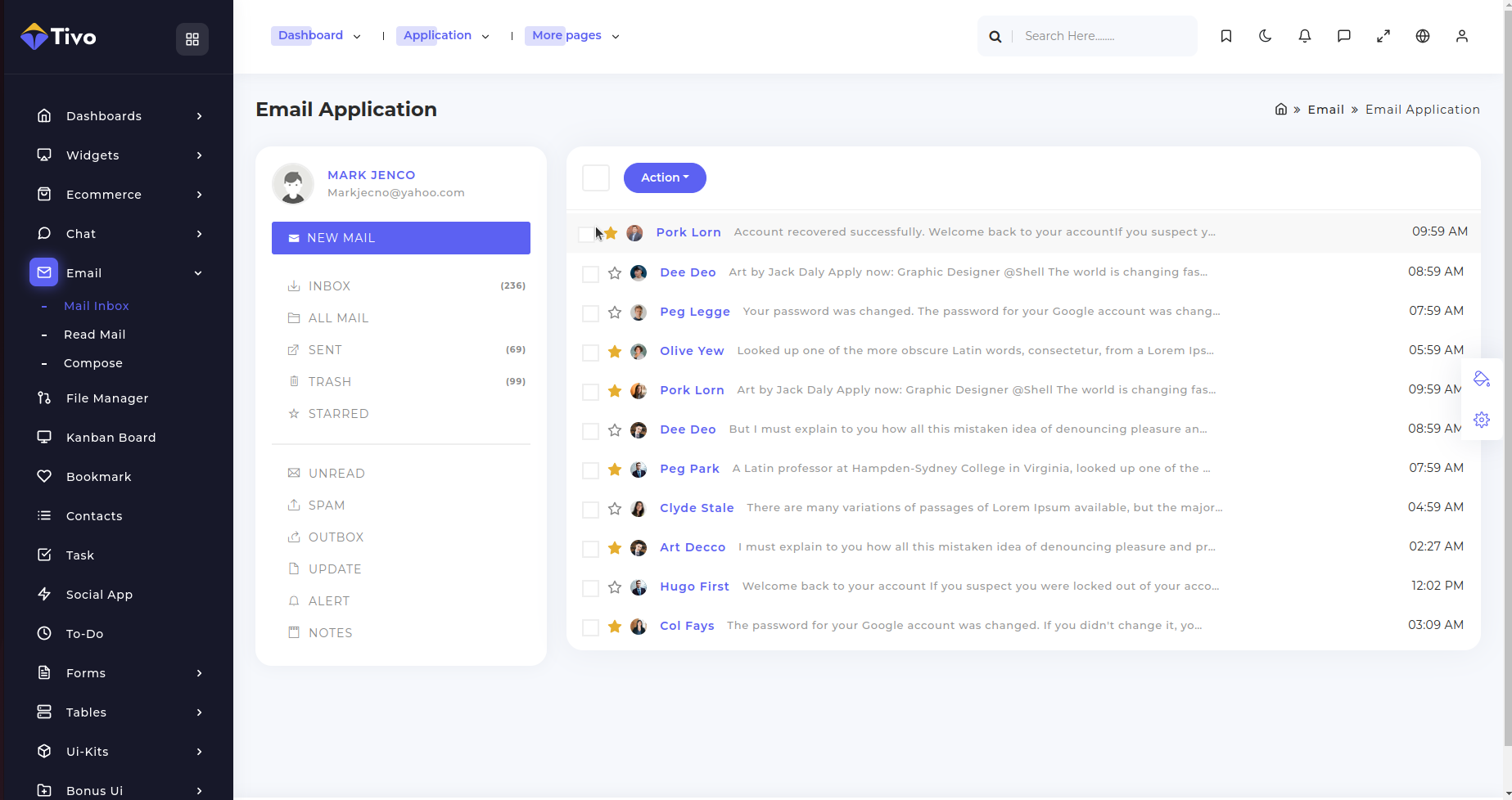 To keep things professional you can add integrate the email application with this theme, to share the important information with your colleagues. We have provided a design for the email application, you can use it and build a fully functional e-mail application.