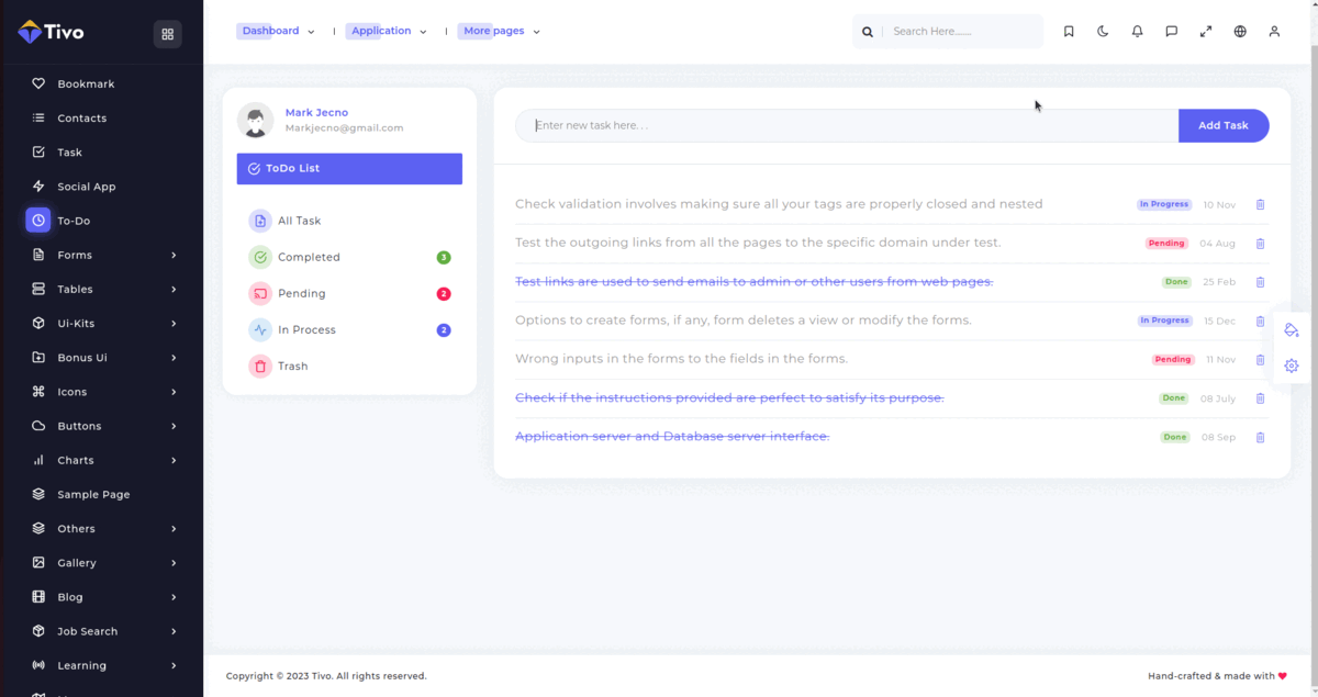 Below link takes you to the design of the application, but it is just the design, data won't be stored anywhere, if you reload the page you will notice that changes will be gone. You can store and modify the todo list by storing it in the database of your liking. To make it easier of the developers we have already give the to-do application integrated with firebase-firestore.