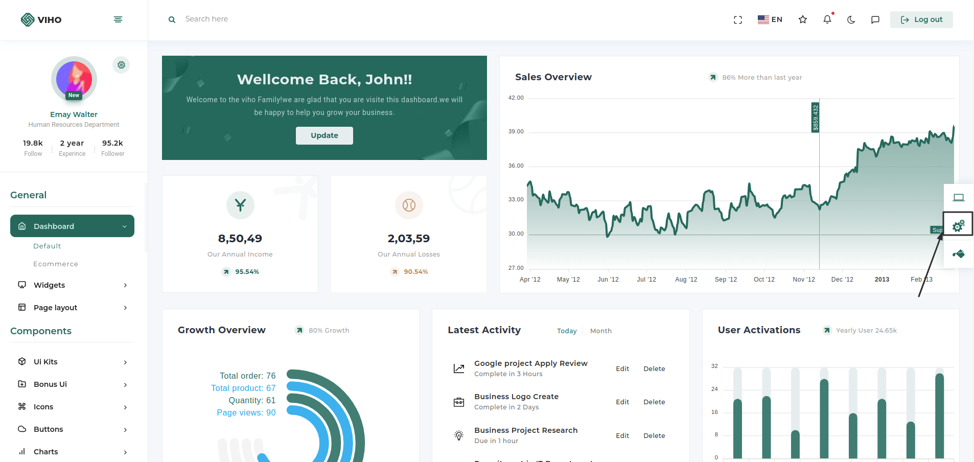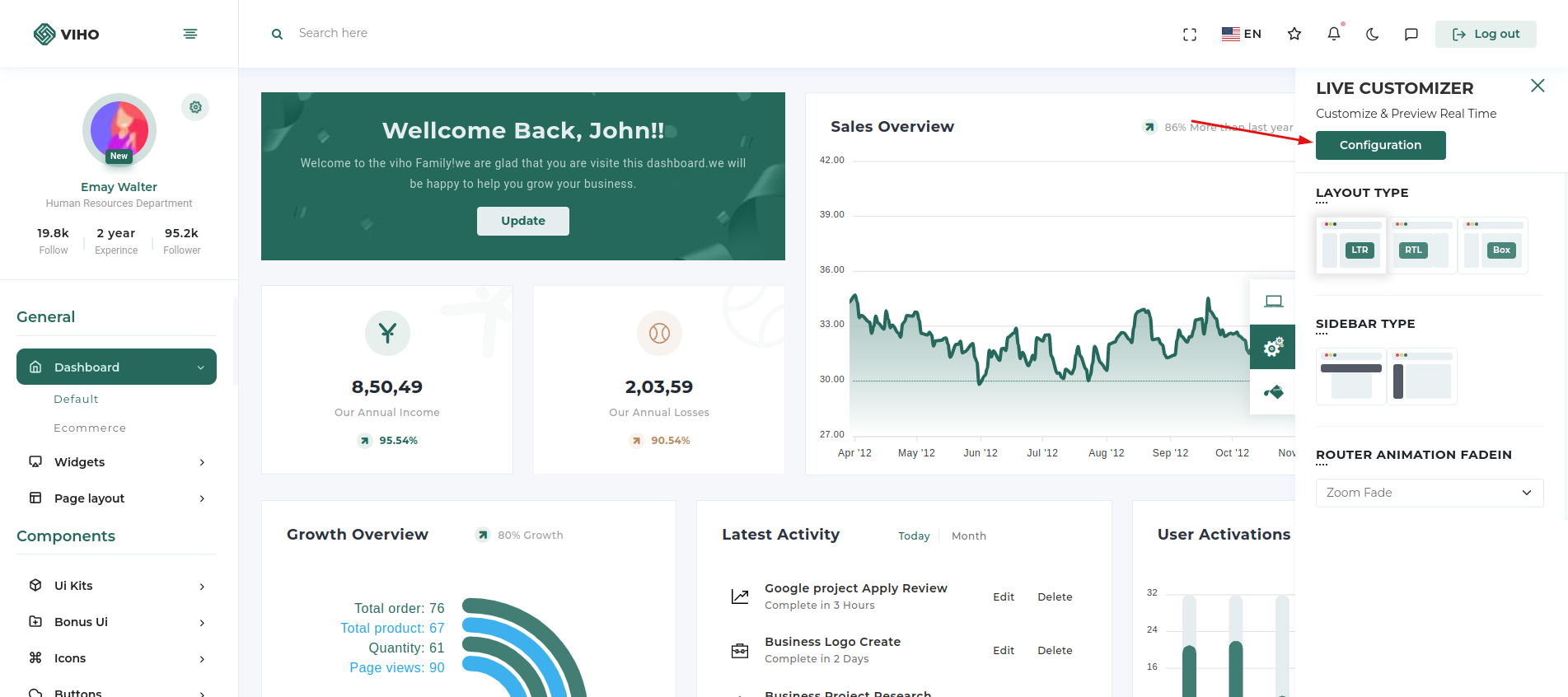 To make this theme according to your preferences we have provided a customizer bar, where you can tweak colors and layout type of the page, primary and secondary colors of the theme, and the layout of the sidebar. We have also provided a configure button from where you can copy the settings and paste in the layout.json file and get the customised layout by as the default layout.