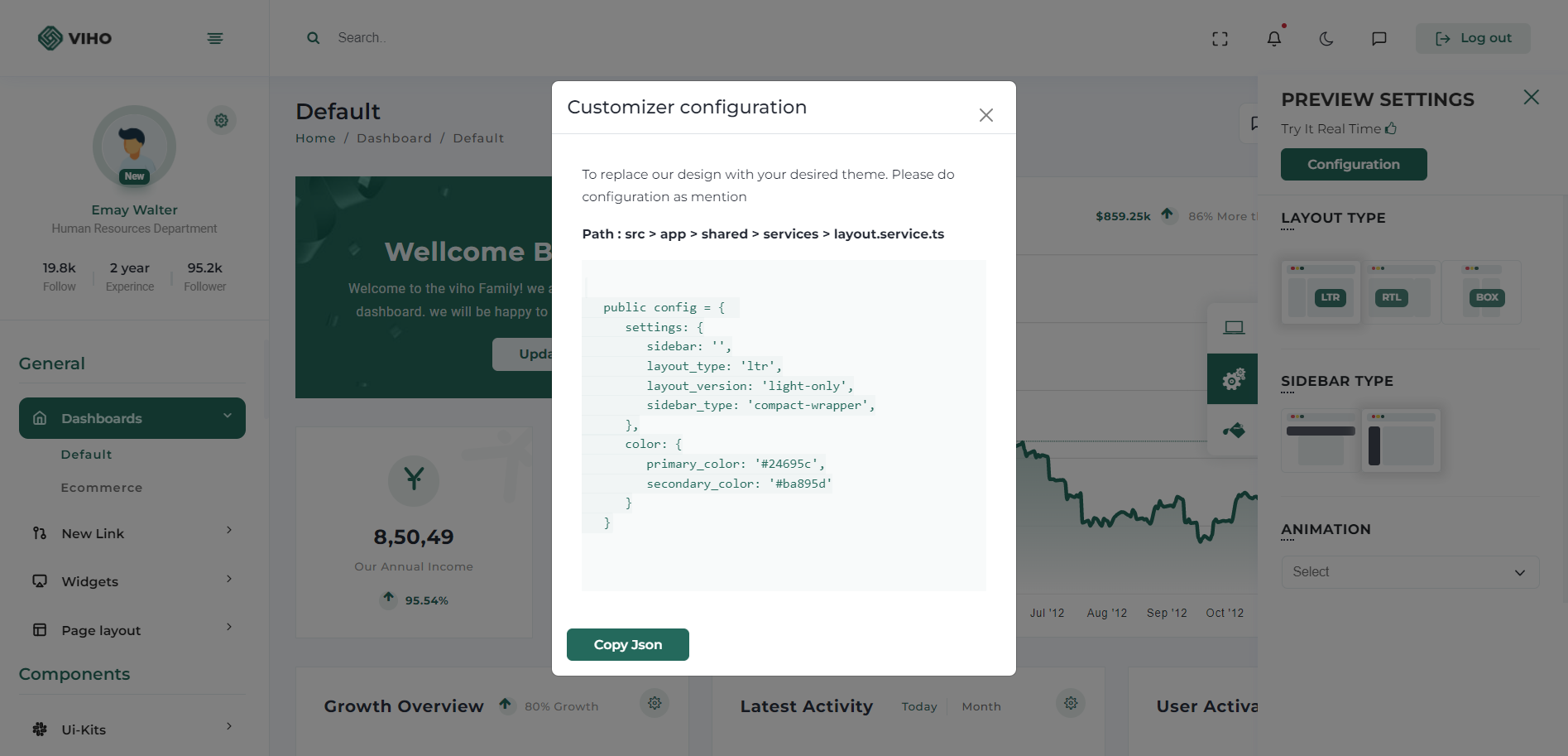 Configuration popup will be open then just click on copy json button which will copy configuration of theme which you want