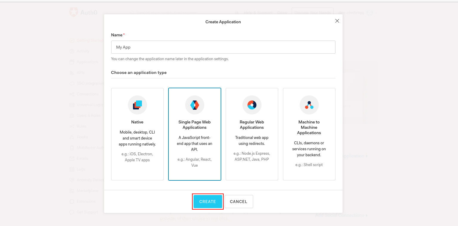 2. Now Go to second option Integrate Auth0 into your application and click on Create Application