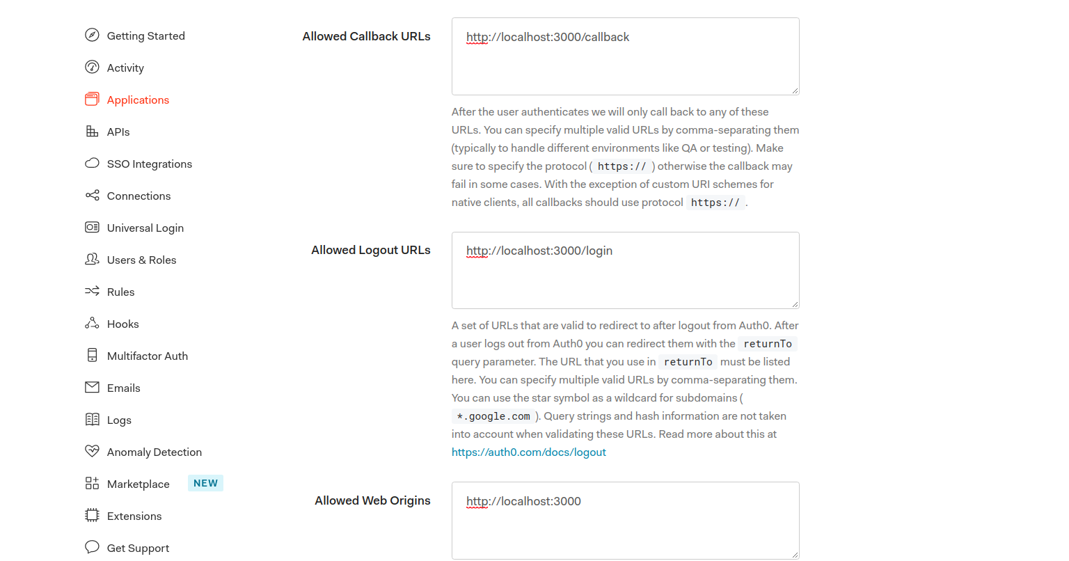 5. Now go to setting tabs and show basic information about your auth0 application name , domain , client id and Set your Callback , Logout and Web Origins Url